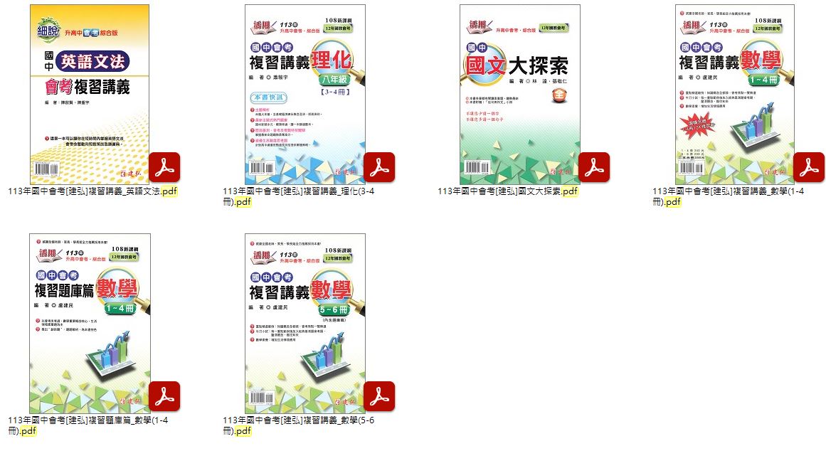 113年國中會考[建弘]國文大探索 + 英語文法 + 複習講義理化 3-4冊 + 複習講義數學 1-6冊 + 複習題庫篇 數學 1-4冊 講義光碟